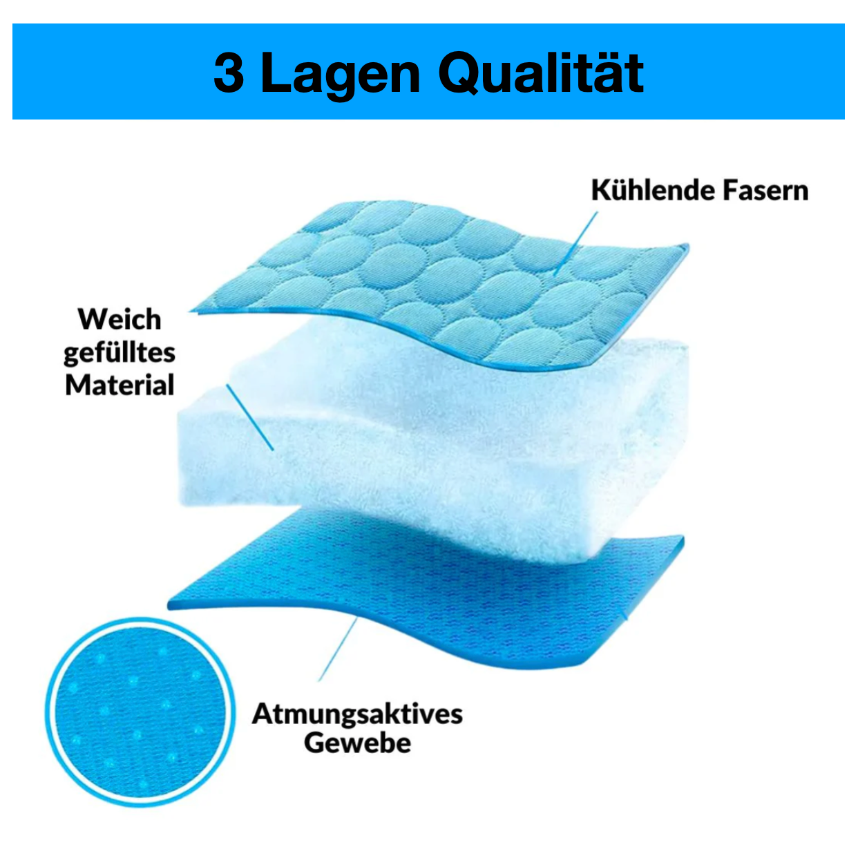 Die spezielle 3-Schicht-Technologie sorgt für eine gleichmässige und anhaltende Kühlung. Die Matte nimmt die Körperwärme deines Hundes auf und gibt ein angenehmes Frischegefühl zurück – ideal für heisse Tage.
